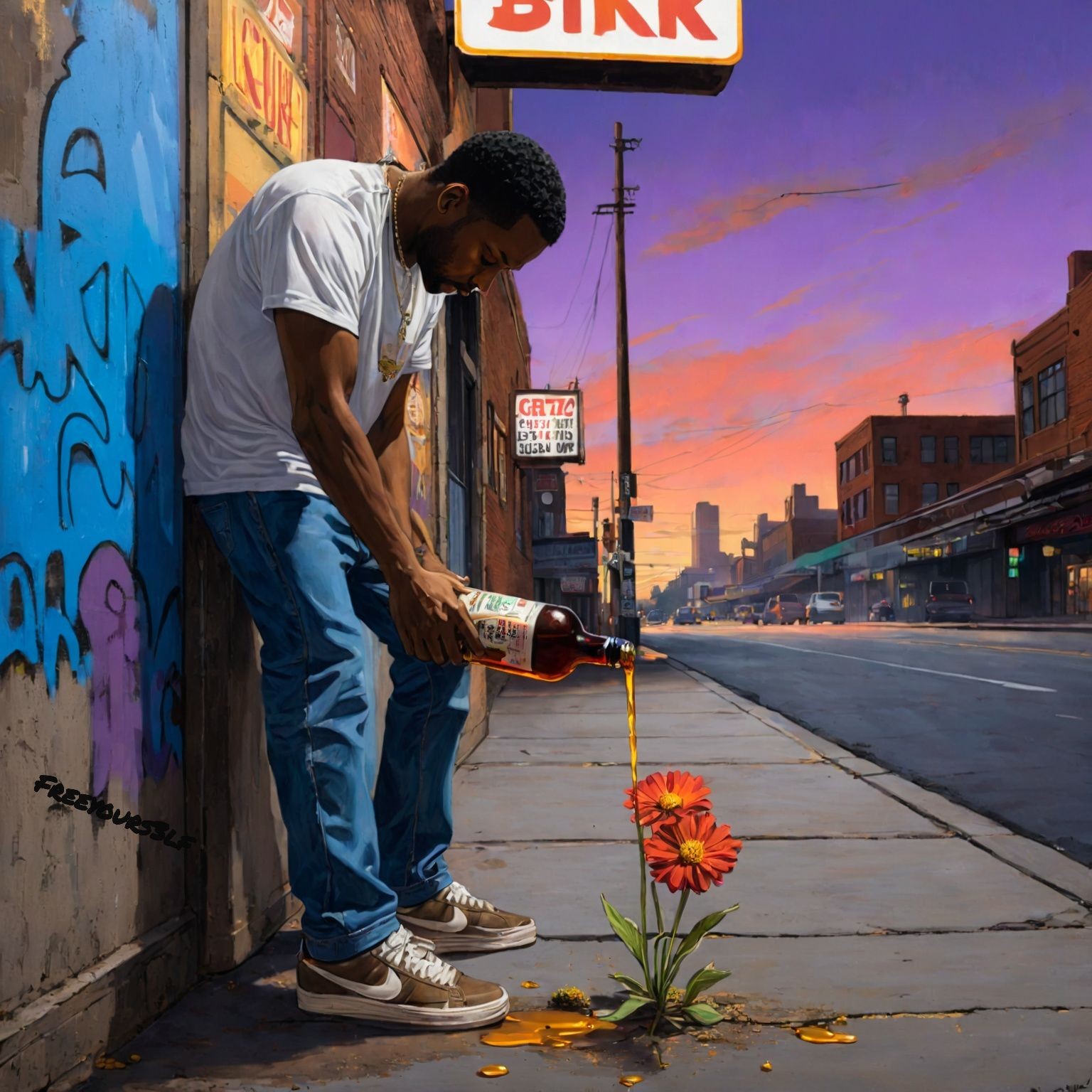 Inspired by Tupac’s The Rose That Grew from Concrete, this piece embodies resilience, loss, and the struggle for peace. The spilled liquor reflects mourning and hardship, yet a flower still blooms—symbolizing beauty rising from pain. Even in the roughest conditions, we push forward, proving that growth is inevitable.